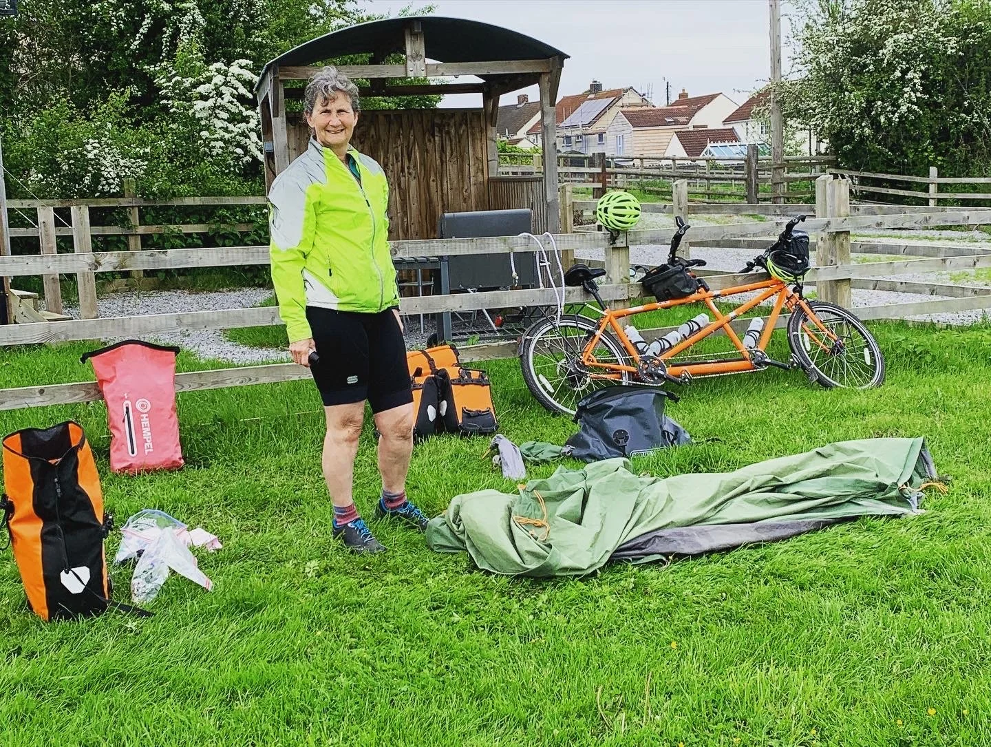 With our purchases stuffed under Edith’s bungees we roll downhill from the Co-Op and arrive at Nut Tree Farm, around 4.30pm, campsite numero uno. We’ve only been going for two and a half hours and, apart from the first 20 minutes, it’s been almost all flat or downhill. What’s even less impressive is that we can still see Priddy mast, the TV transmitter, just a few miles from our house. Maria the campsite owner spots us, waves, and comes over to show us to our pitch. While we push Edith through the lush grass Maria asks about our trip, she says all the right things and leaves us to it.