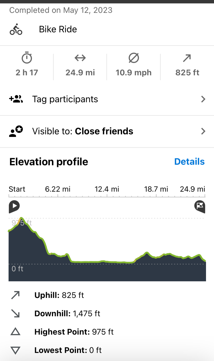 “How fast are we going?” is a question I ask Nicky a fair amount. I don’t want to break records, but guessing our speed is one of the few games you can play with both hands on the handlebars and your feet busy on the pedals. Nicky is running Mission Control; between her watch and phone she probably has way more computing power than launched Apollo 11. Speed, position, route, elevation, time to destination, she has it all, that is if she’s pressed the right buttons and remembered to start the gadgets. Having done a few miles with Edith now, I’ve got a feel for what’s happening and I’m not too shabby at guessing our speed. In 14th, our top gear, on a decent flat surface, we cruise at 12-17 miles an hour depending on the wind.