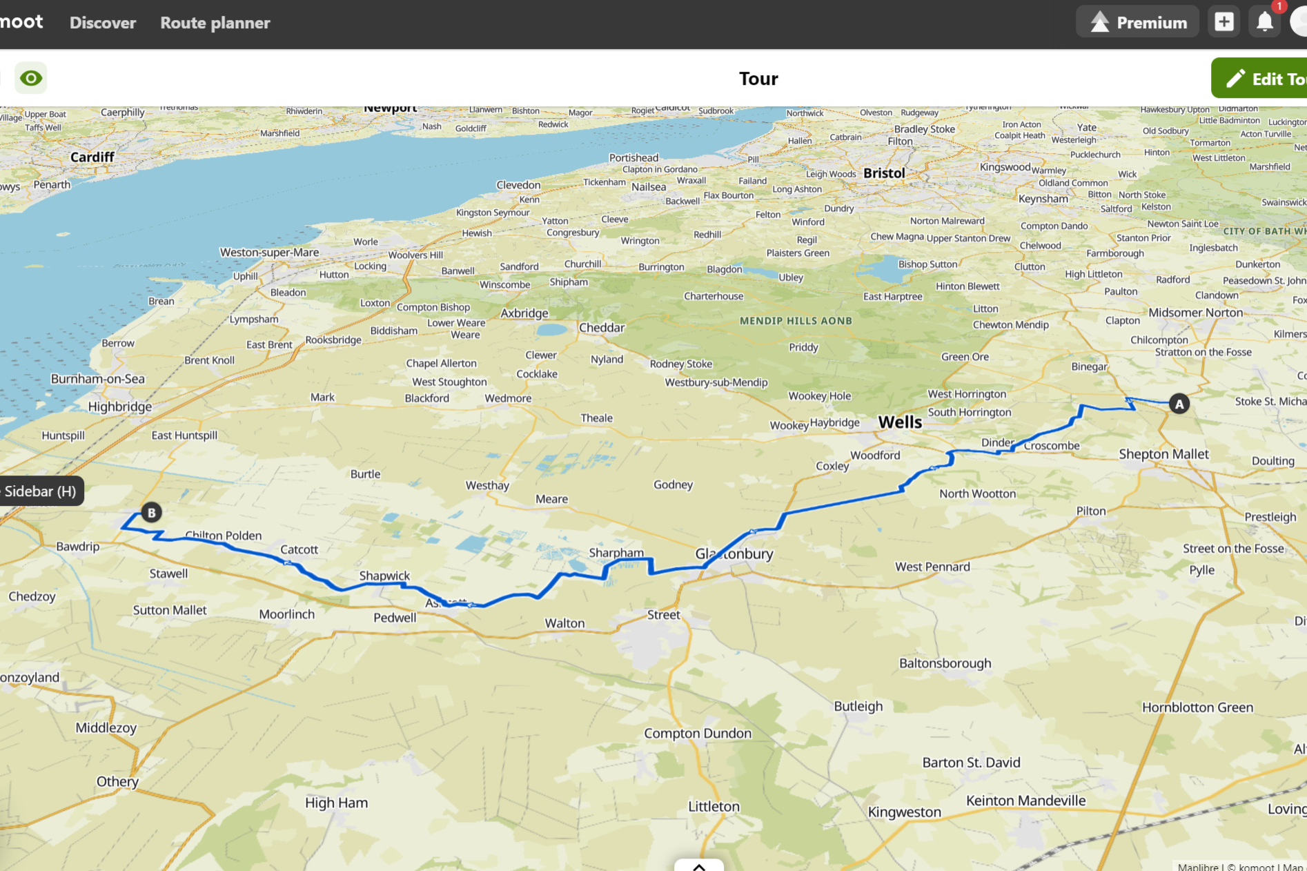 Half a mile further on, at the Mendip golf course, we spot our friend Julian, we are truly knackered by now, so we stop gratefully and tell him where we are going. I think he believes us, but I get the impression that he’s wondering if he’ll ever see us again. Soon after, we are at a high point and can see Glastonbury Tor and the Somerset Levels laid out below us. We don’t look back, but if we had, it would have been our last glimpse of home until we get back to this spot in mid-June.