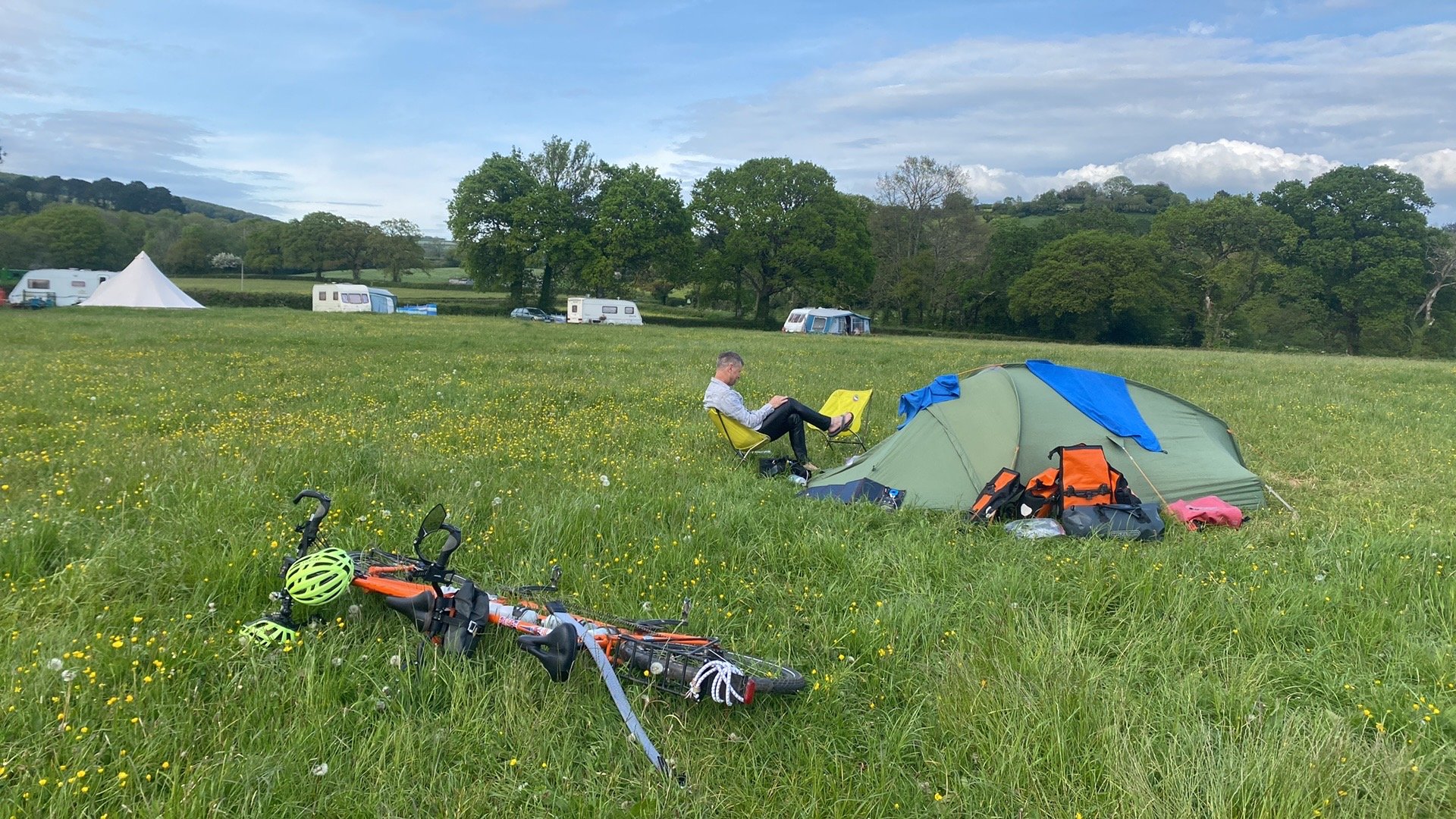 We stop in Chudleigh for more calories and a tuneful rendition of Daisy Daisy from a couple of lads outside the pub. After 36 miles we reach Ashburton, after a slog along narrow rutted cycle paths. We prop Edith against a bin while Nicky goes into a shop for our evening meal and liquid entertainment. Nice lady comes over and has a chat, she has 4 Thorn bikes, in various configurations, she takes a picture of Edith to show her hubby. Nicky returns with supplies, which we stuff into the day bag. Not far now, it’s just over a mile to Summer Hill campsite just outside the village, then we can relax.