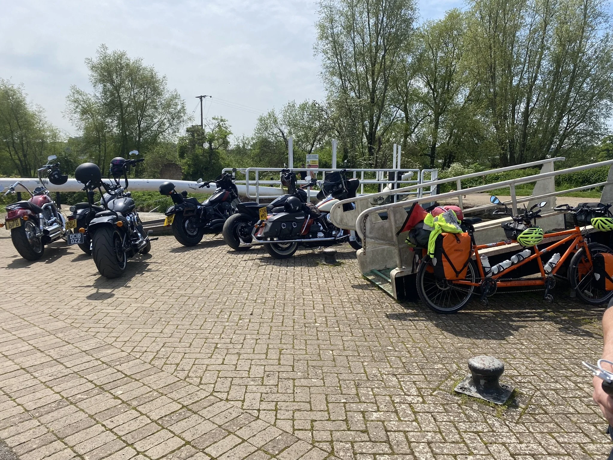 We’re an hour early at the Double Locks, so we park Edith amongst a pack of Harley Davidsons, which makes for a good family chat pic’. We set Edith’s £15 Amazon bike alarm using the key fob remote, it really is excellent value. If you try and move her, you get a gentle warning, if you continue, the alarm will throw its toys out of the pram and yell at you.